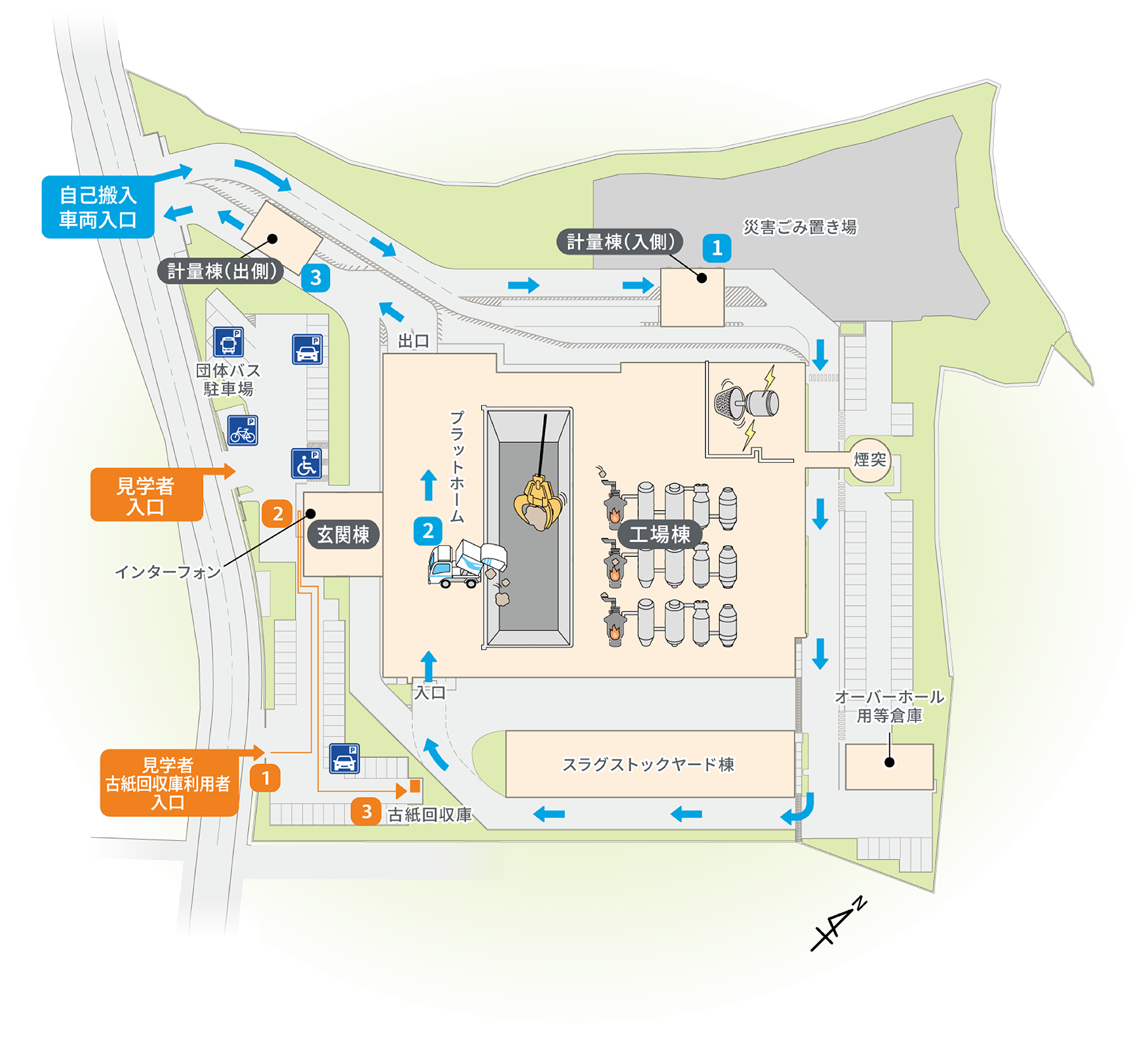 古紙回収庫利用者入口から入場頂き、古紙回収庫付近に駐車ください。